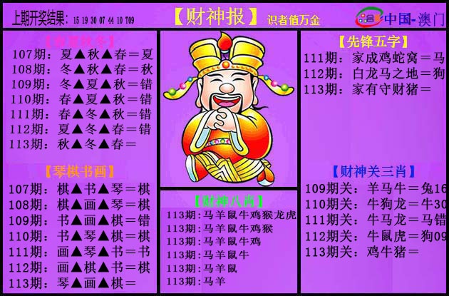 113期: 澳门六合彩彩圖信封【黄财神报】每期自动更新